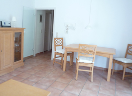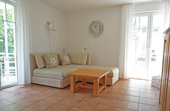 Der 20 m² große Wohnraum mit Stereoanlage, Fernseher, Blu-ray / DVD-Player, komfortabler Couch und geräumiger Essecke lädt zu ruhigen Mahlzeiten und Entspannung am Abend ein. Die beiden sonnigen Balkone zur Seeseite und nach Südosten bieten einen schönen Platz, dem Rauschen des Meeres zu lauschen und den Blick durch den Kurpark auf das Blau der Ostsee schweifen zu lassen.
